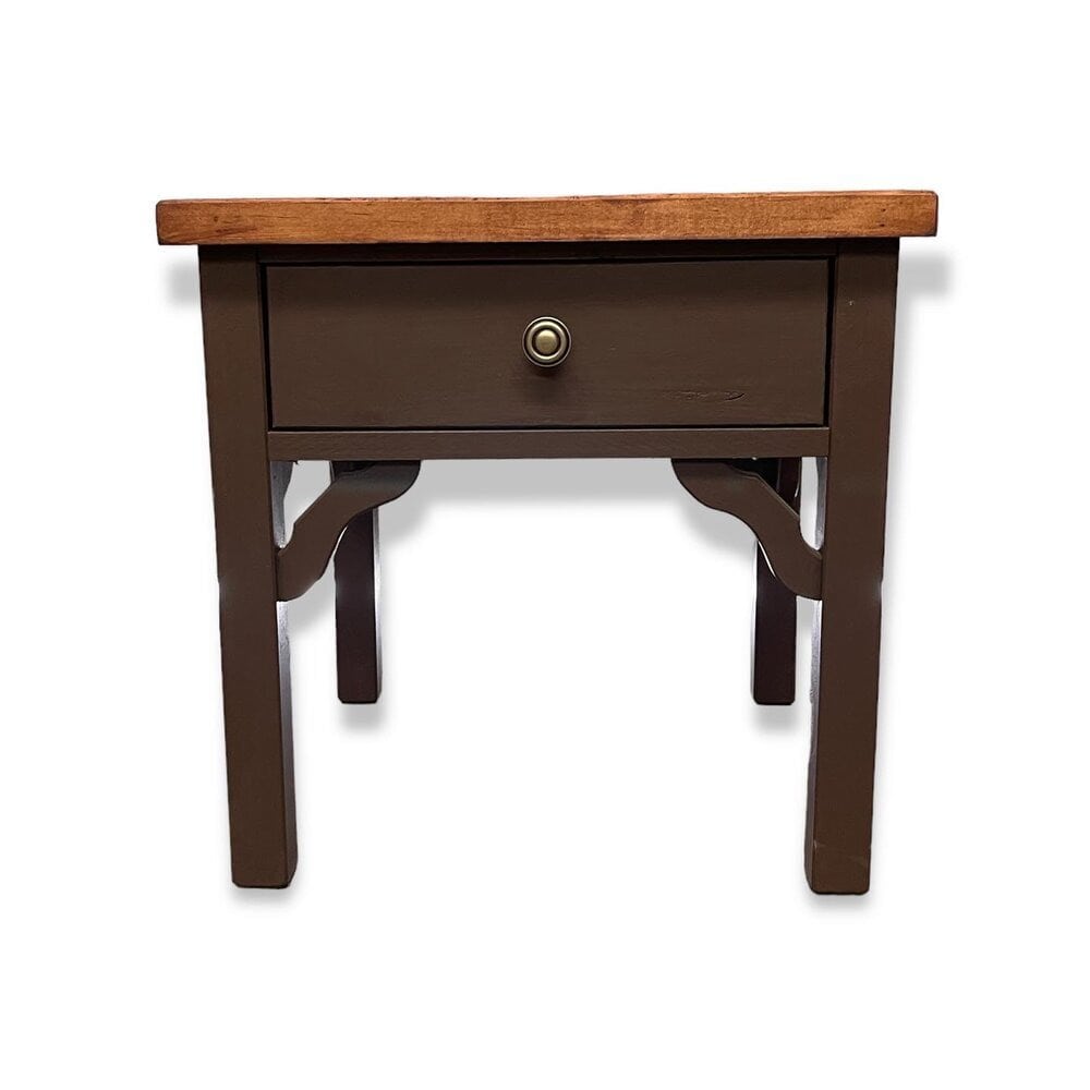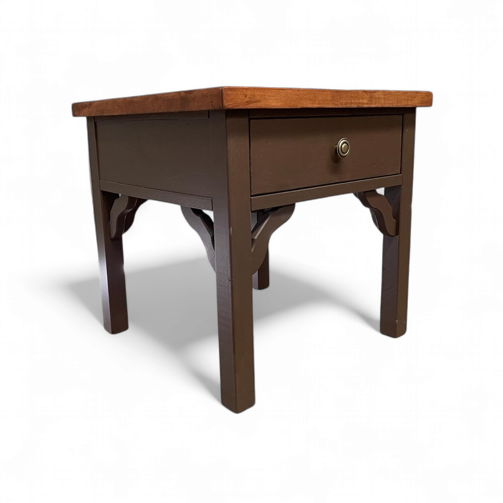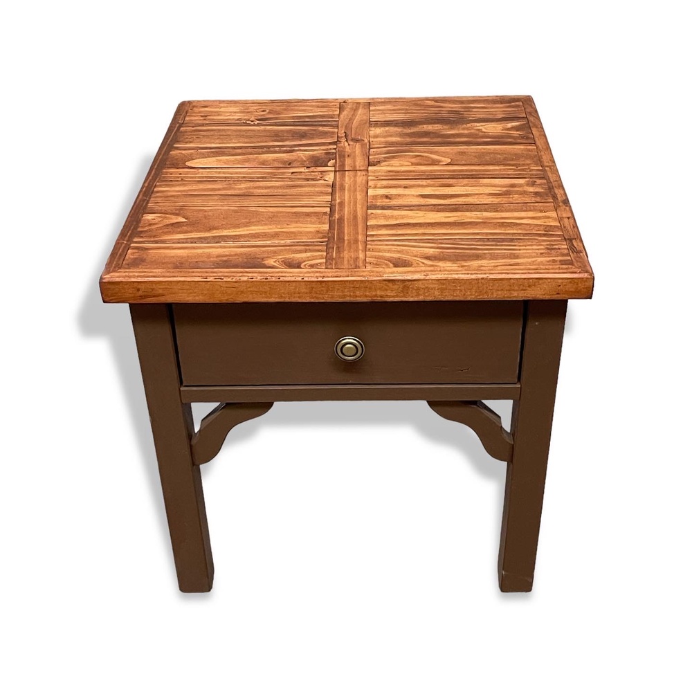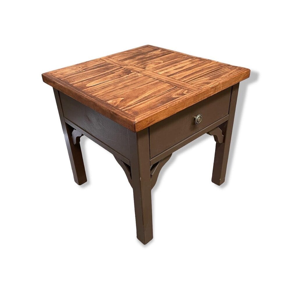 Añade un toque rústico y funcional a tu hogar con nuestra mesa lateral de la nueva línea RIGETT. Esta mesa, en color café con una elegante cubierta de nogal con vetas, está fabricada en madera sólida y decorada con detalles diagonales en sus patas que realzan su diseño único. Cuenta con un cajón práctico, ideal para guardar tus pertenencias y mantener tu espacio organizado.
