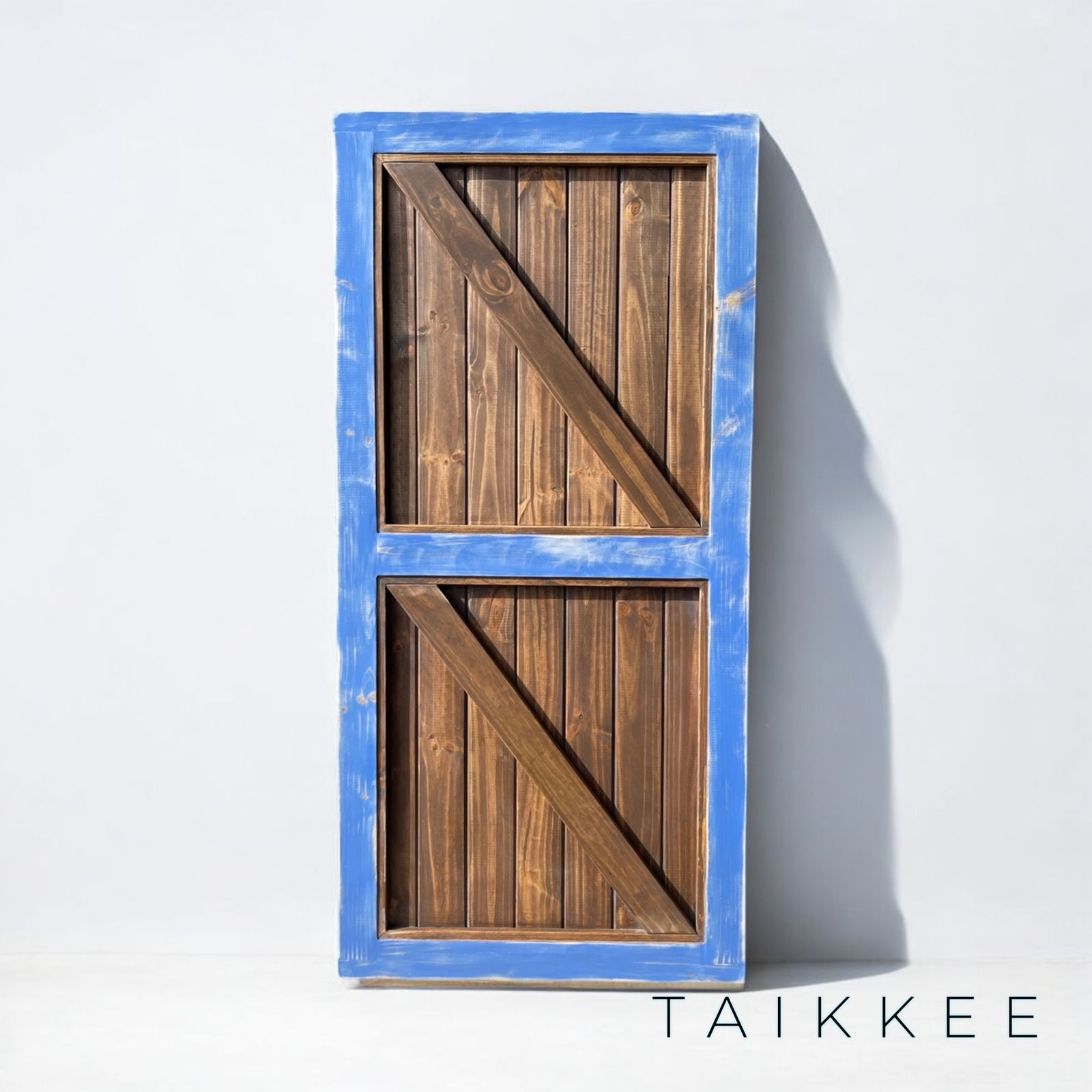 Puerta Rústica de Madera color café con marco azul – Estilo Granero Personalizable