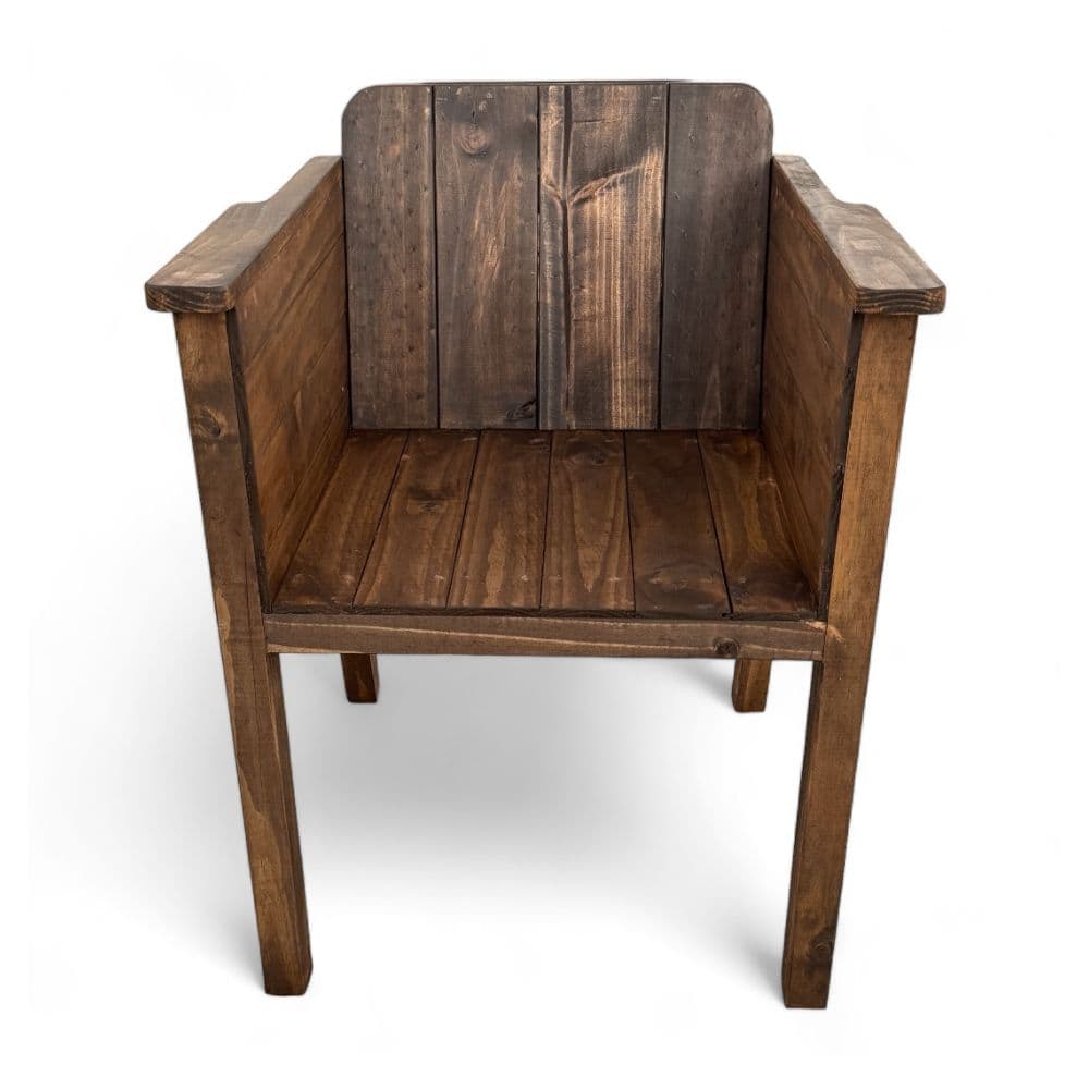 Este sitial es perfecto como pieza única de mobiliario que añade estilo y calidez a cualquier espacio, destacando por su diseño rústico y durabilidad gracias al acabado de nogal oscuro y sellante de poliuretano.